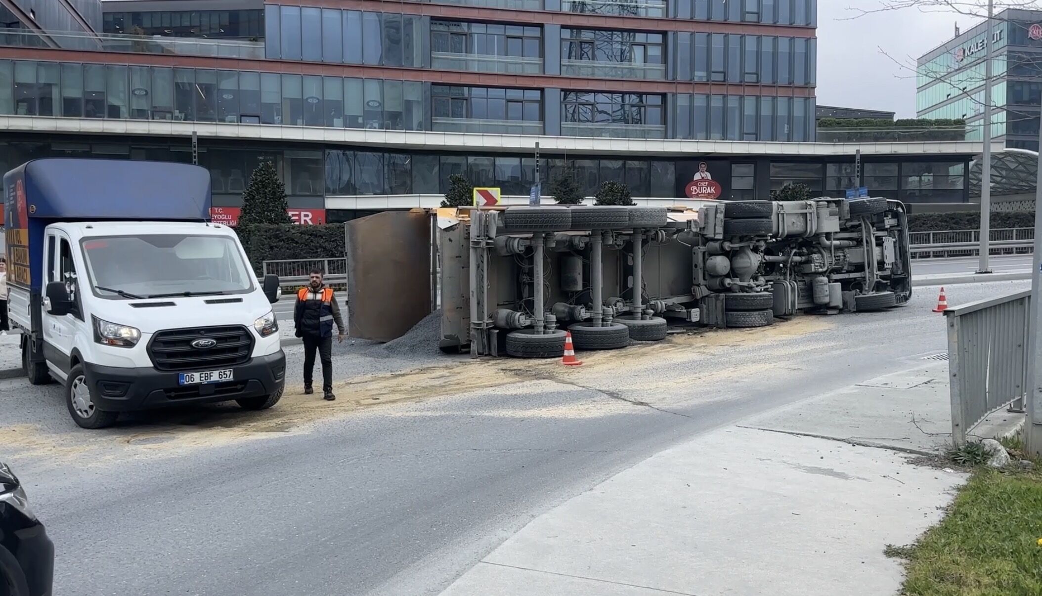 İstanbul Sarıyer‘de mıcır yüklü hafriyat kamyonu virajı alamayarak devrildi. Yaralanan kamyon şoförü hastaneye kaldırılırken kaza nedeniyle oluşan trafik yoğunluğu havadan görüntülendi.